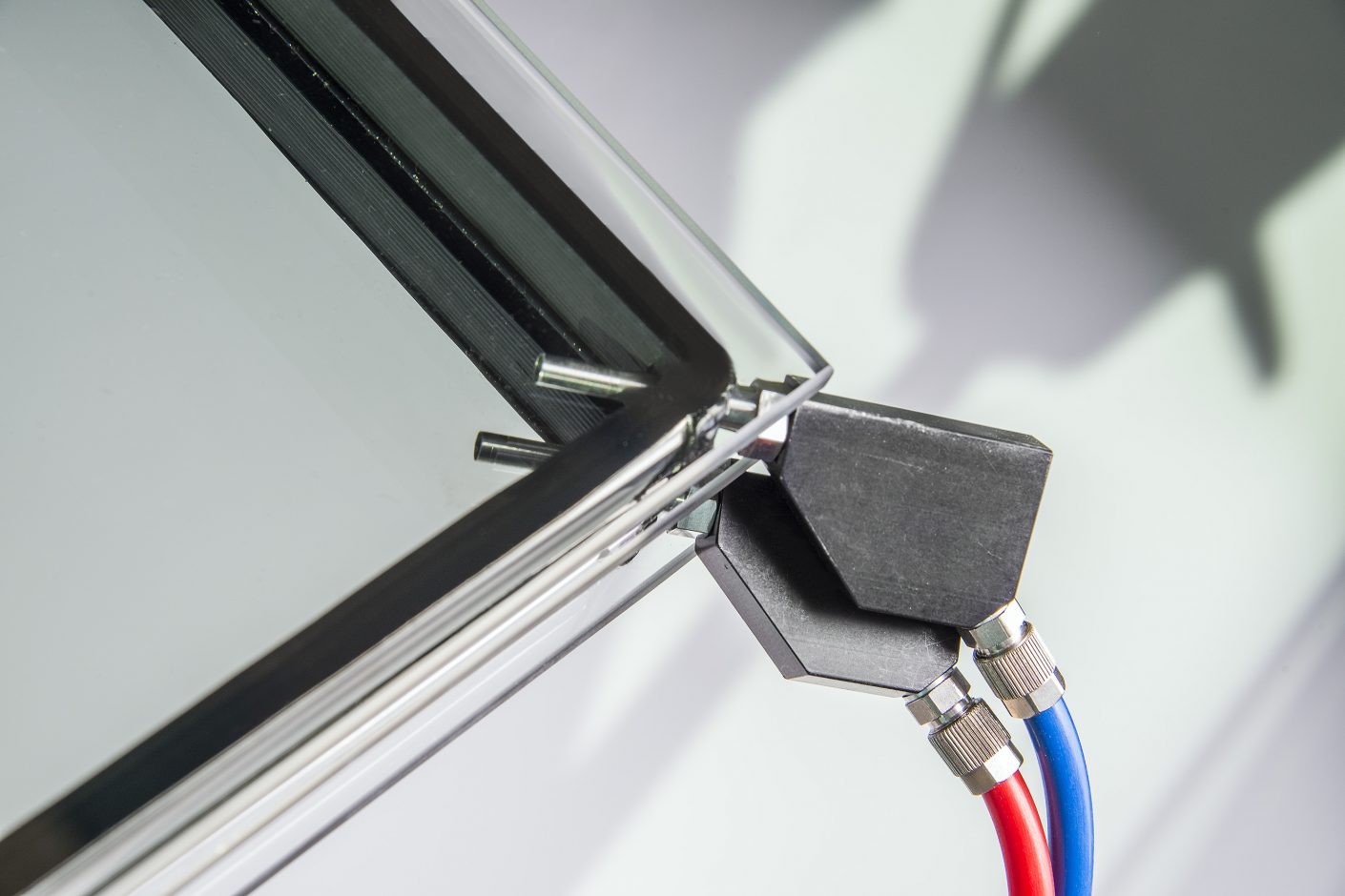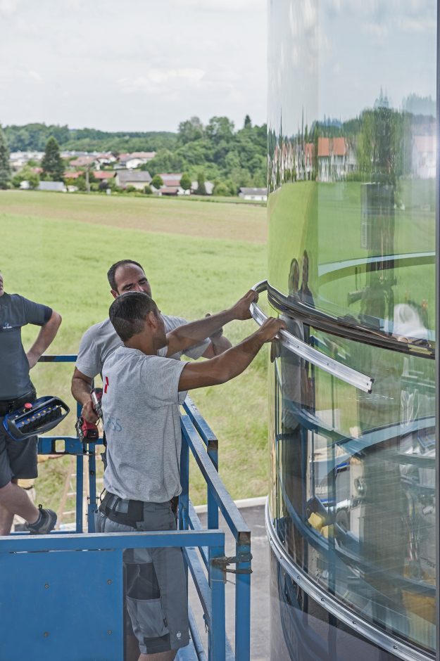 „Die vorgebogenen Profile konnten wir anschließend wie gewohnt mit Trockenmittel befüllen, mit Butylband versehen und mit Eckwinkeln zu Rahmen stecken“, ergänzt Gregor Wenna, Geschäftsführer beim Spezialisten für gebogenes Isolierglas. „Von innen nach außen haben wir das Dreifach-Isolierglas anschließend aufgebaut, die Elemente mit Zwingen verpresst, Edelgas eingefüllt und abgedichtet – alles ging erstaunlich einfach, da Glas und Abstandhalter sehr präzise verarbeitet waren.