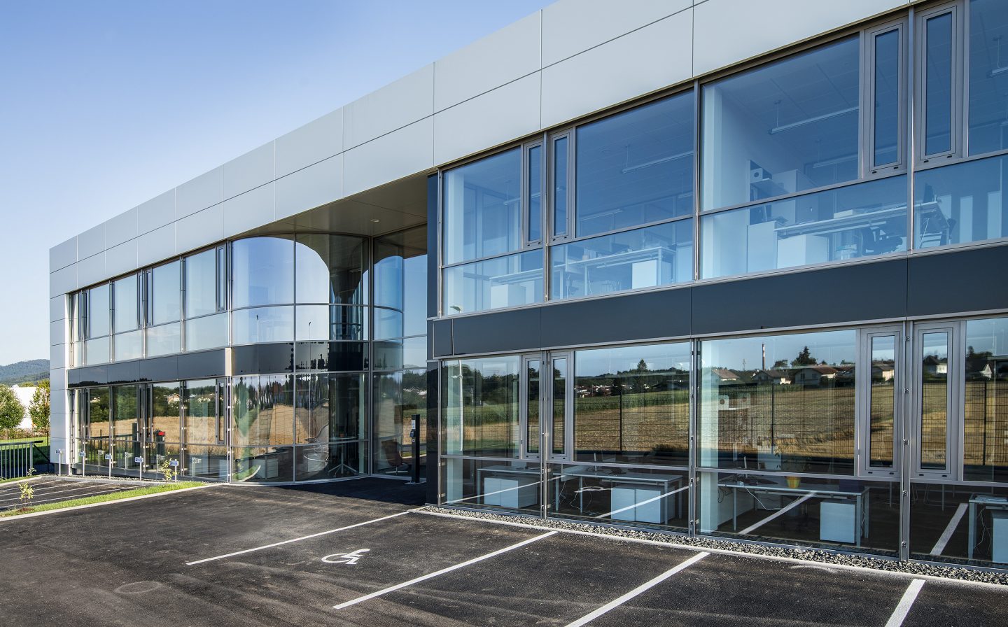 „Die gradlinigen Konturen, die das Bauwerk in Seewalchen prägen, haben wir im Eingangsbereich bewusst abgerundet“, erläutert Michael Frey, Geschäftsführer von Schmelzle + Partner Architekten. „In der Formensprache spannen wir so einen Bogen von den Hightech-Anwendungen zu den Menschen, die hier mit ihrem speziellen Know-how im Bereich der Hochleistungskunststoffe maßgeschneiderte Lösungen für die Kunden entwickeln.“