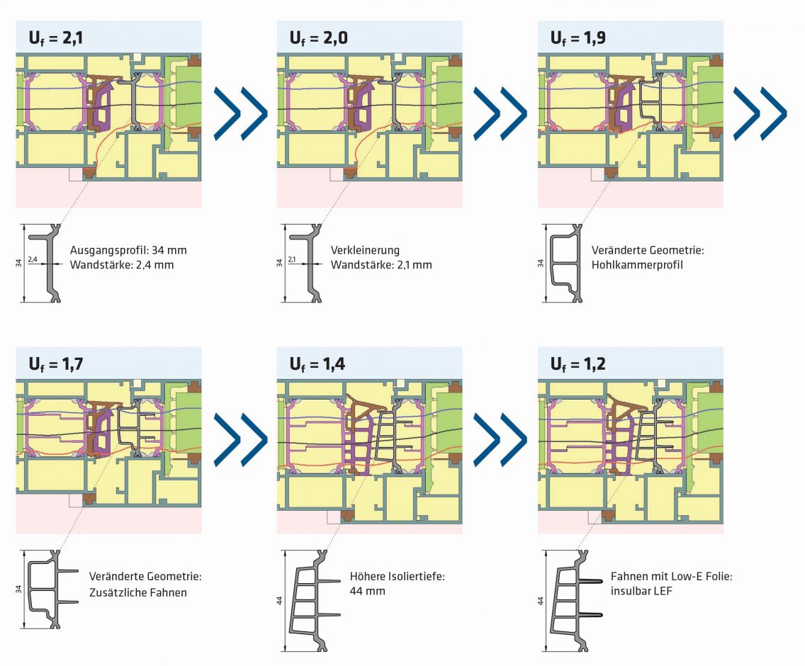 - The reduction of wall thicknesses and increase in insulation depths of these insulating profiles are further possibilities for keeping the heat transfer through transmission at a low level.